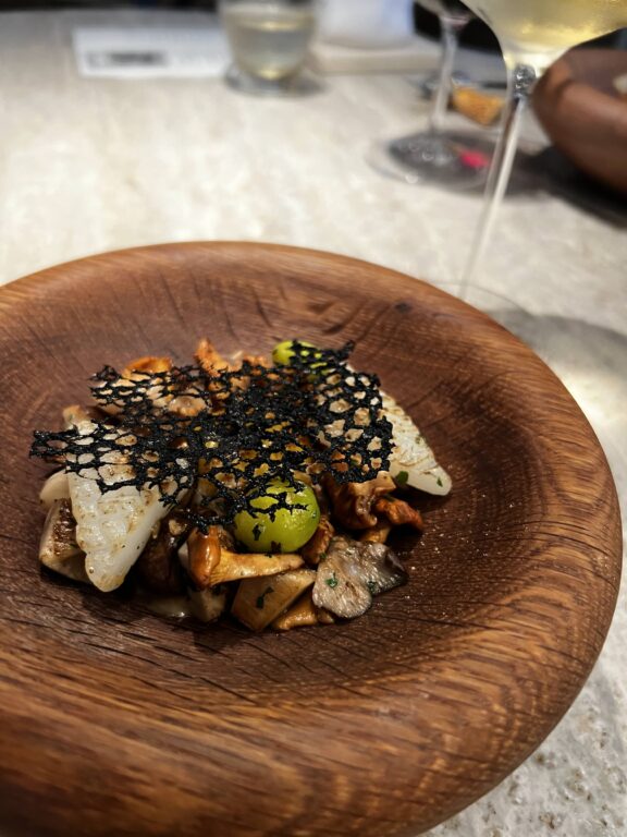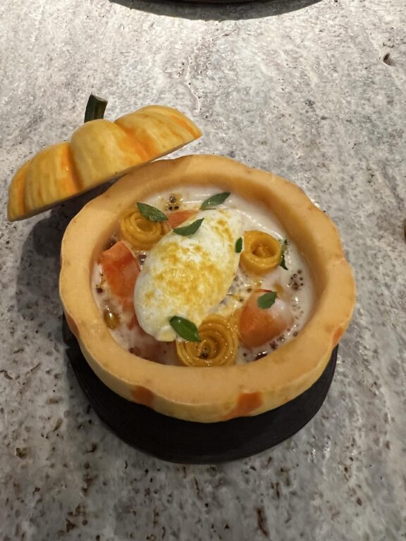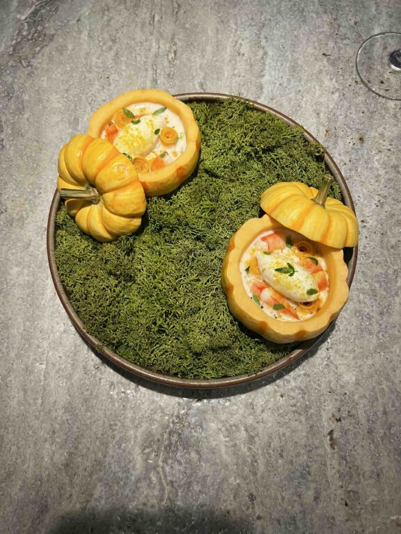カボチャの頭をくり抜いたユニークな器 の中に、バターナッツカボチャのピューレや生で食べられるカボチャのスライス、そしてアジアタイのエビが詰められています。アクセントとして添えられているのは、わさびで作られたすっきりとした絡みのあるクリーム。このクリームをエビやカボチャと一緒にいただく、見た目、そしてならではの世界観が楽しめました。