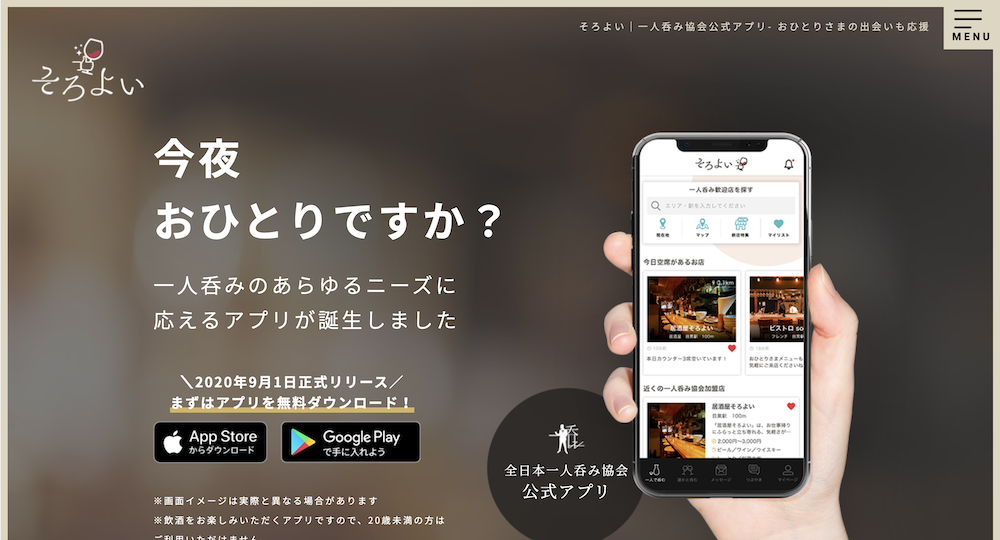 - 協会公式アプリ「そろよい」: 現在地から一人呑み歓迎のお店を探せるアプリを展開し、若者の酒場離れや個食化が進む現代において、新しい飲食文化の創造に取り組んでいます。